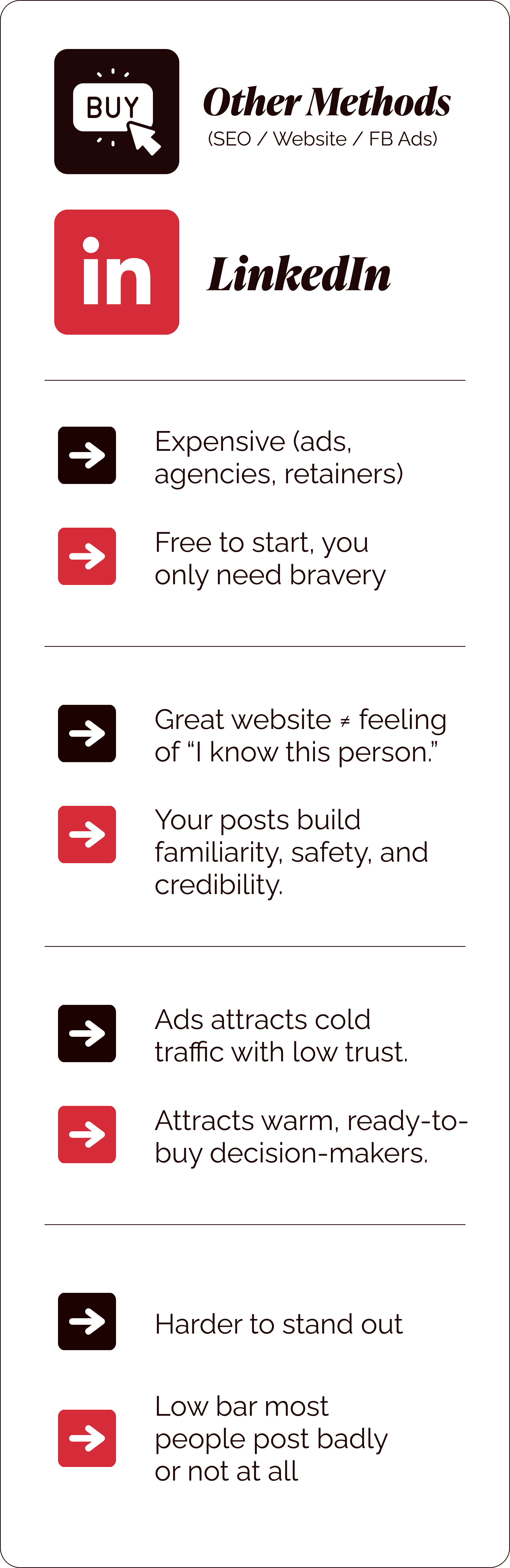 Noticing your sales calls get shorter and easier because prospects show up knowing they want to work with you, because your LinkedIn presence has convinced them already