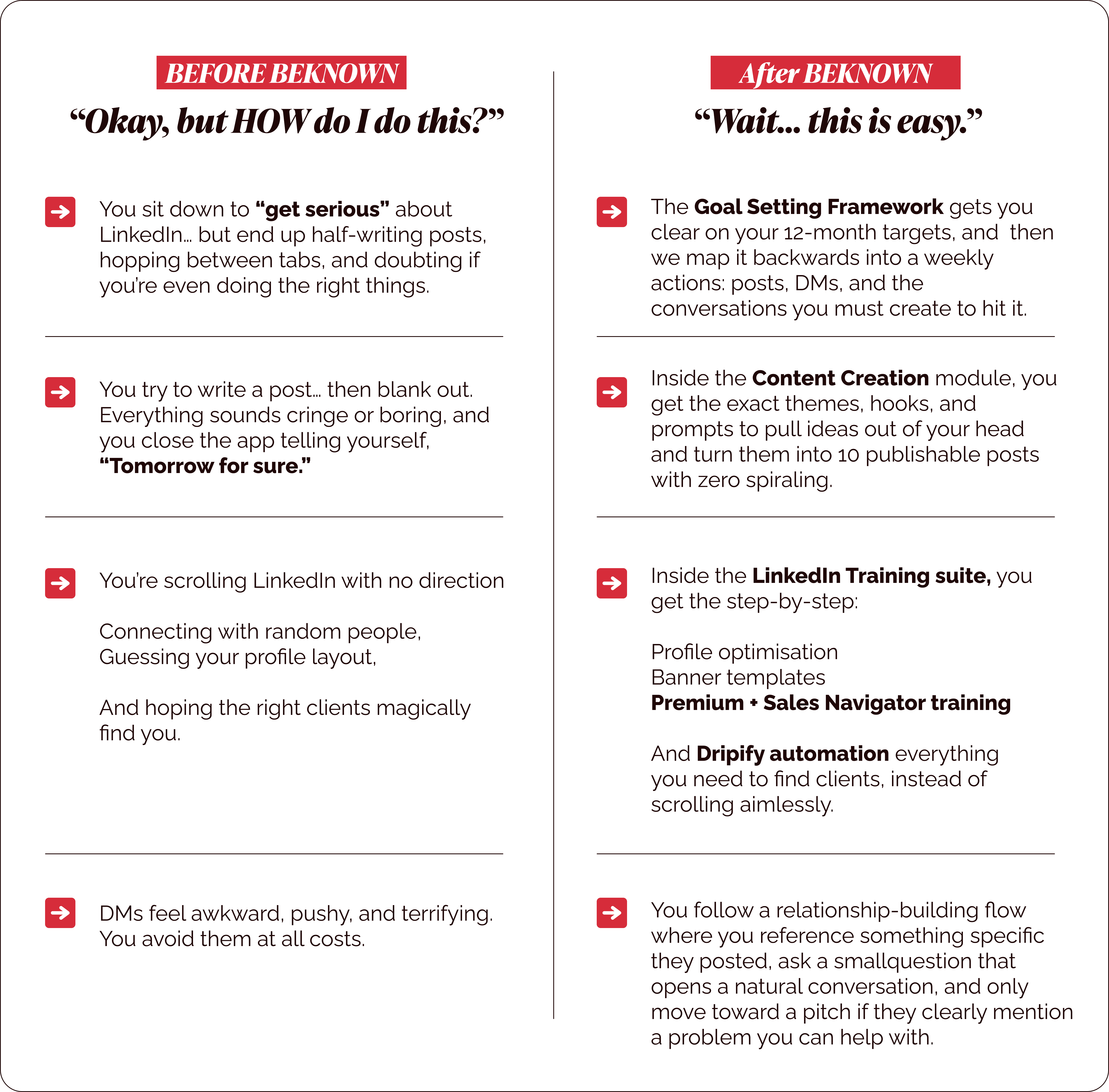 Yes… and no. YES — BeKnown gives you everything you need to actually convert on LinkedIn: -Done-for-you DM templates that start real conversations - The “How Not to Get Ghosted” workshop, so people reply and stay engaged - Posting frameworks that attract decision-makers - Systems for turning profile views into warm leads - Step-by-step guidance on moving someone from comment → DM → booked call BUT… none of it works if you don’t show up and do the work. It only works when you do. And I’ll support you every step of the way but you still have to take the steps.