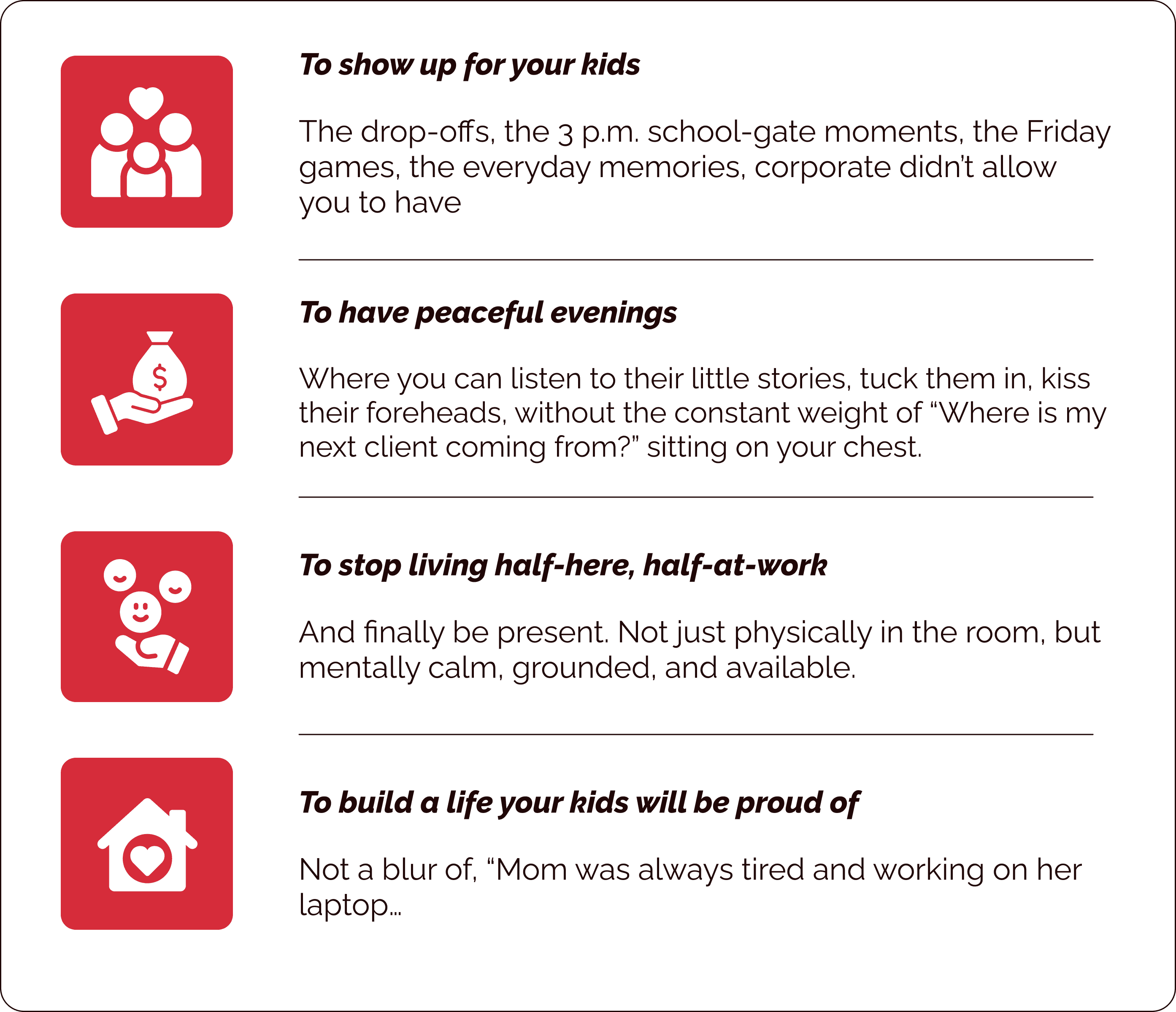 You walked away from the pressure, the metrics, the “don’t bring emotions to work” culture… from the 6 a.m. departures and 9 p.m. returns… from the years of feeling like you were missing the very people you were working so hard for.